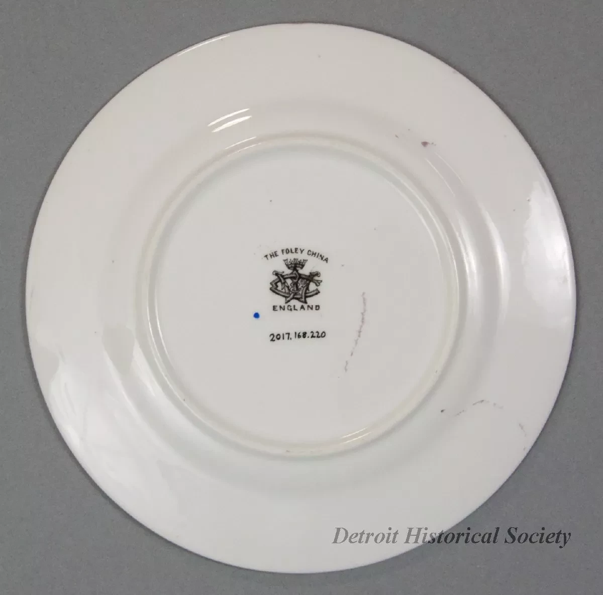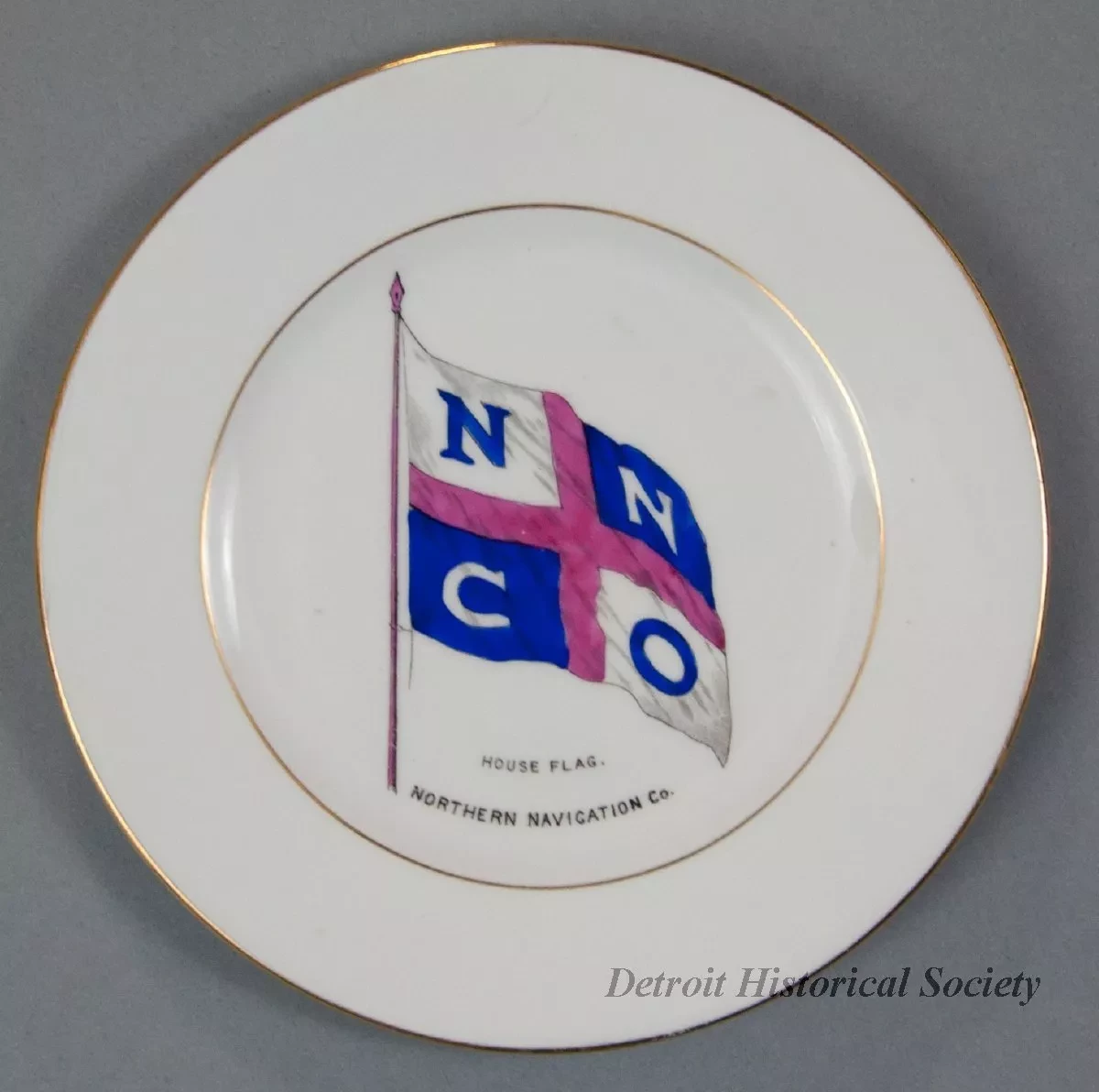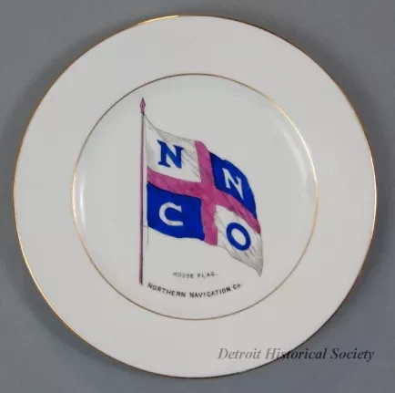 One souvenir dessert plate from the Northern Navigation Company. The round plate is made of thin, white glazed china. It has a flat, slightly-upturned rim and a rounded outer edge. Narrow gold-colored stripes encircle the rim along the outer and inner edges. A red/white/blue image of the company flag is painted at the center of the plate. Small black text beneath the flag image reads "House Flag, Northern Navigation Co." The underside is stamped with a crown/monogram logo that shows the letters, "WC [Wileman and Company]," along with black text that reads "The Foley China, England."