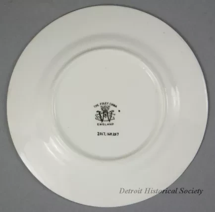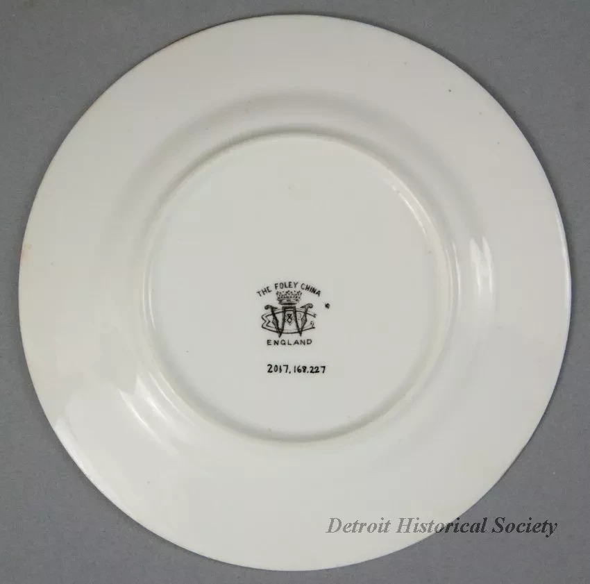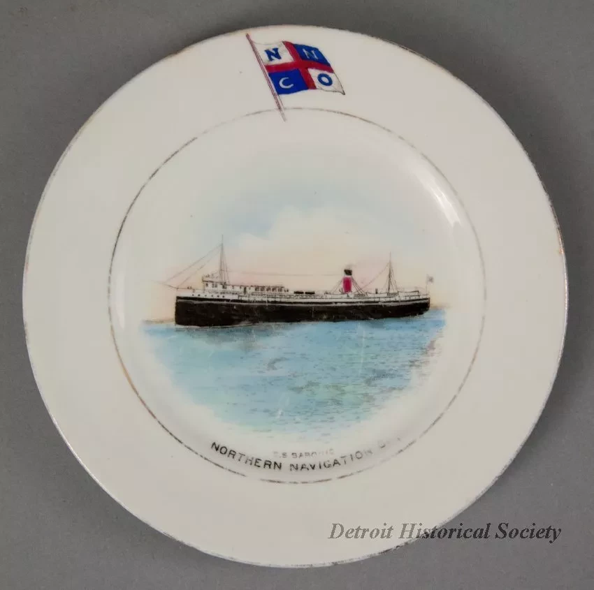 One souvenir dessert plate from the Northern Navigation Company. The round plate is made of thin, white glazed china. It has a flat, slightly-upturned rim and a rounded outer edge. Narrow gold-colored stripes encircle the rim along the outer and inner edges. A small red/white/blue image of the company flag is painted on the rim at the top of the plate. Also, a multicolor image is painted at the center of the plate that depicts a port side view of a passenger steamship. Small black text beneath the steamship image reads "SS Saronic, Northern Navigation Co." The underside is stamped with a crown/monogram logo that shows the letters, "WC [Wileman and Company]," along with black text that reads "The Foley China, England."