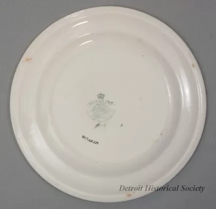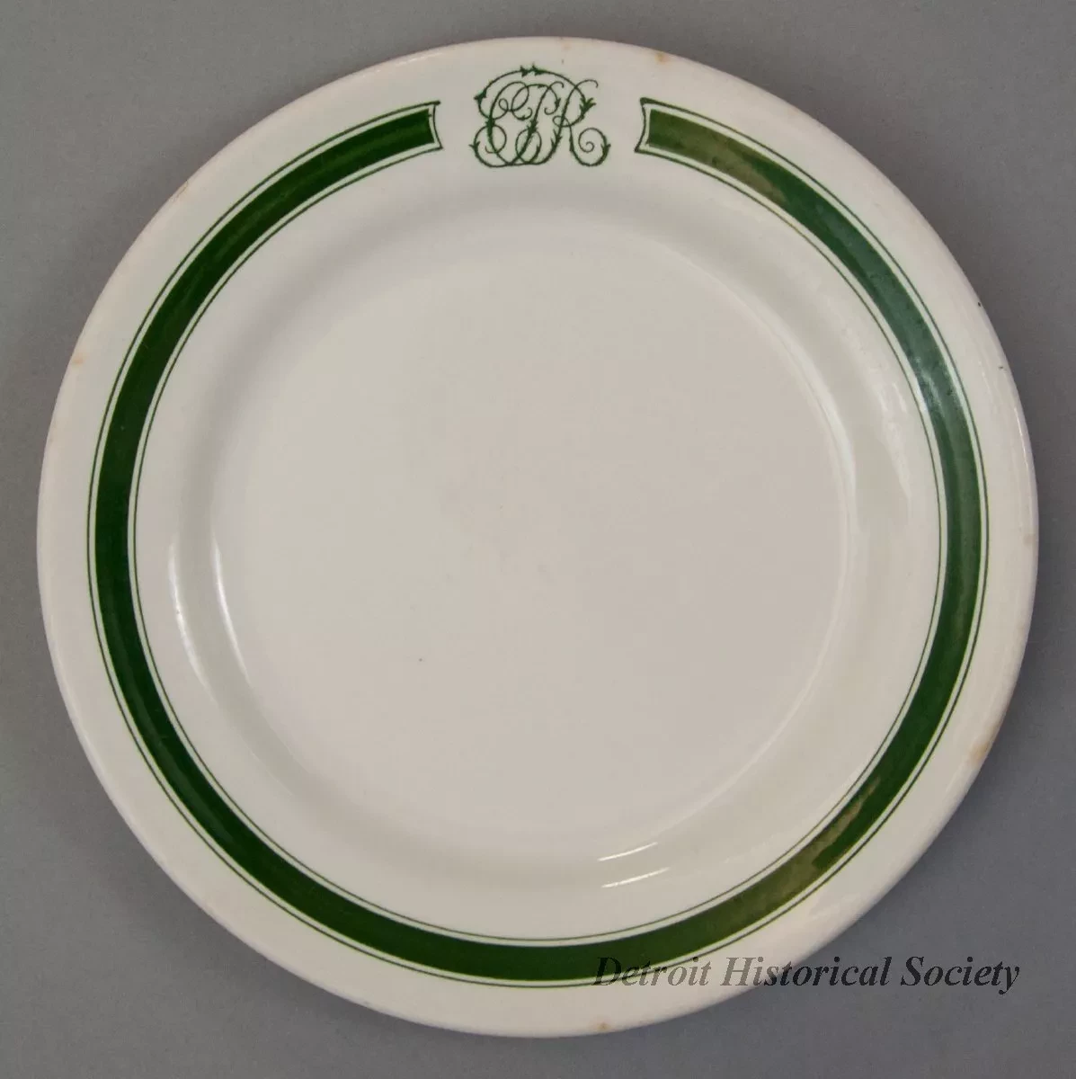 One dessert plate from the dining room of the passenger steamship, SS KEEWATIN, of the Canadian Pacific Railroad Great Lakes fleet. The round plate is made of heavyweight white glazed china. It has a flat, slightly-upturned rim and a thickened outer edge. A wide green band encircles the rim along the midpoint. At a break in the band, decorative green script text shows the letters, "CPR [Canadian Pacific Railroad]." Stamped black text on the underside of the plate reads "Duraline, Super Vitrified, Grindley Hotelware Co., England," and "Cassidy's, Ltd., Montreal, Vancouver, Winnipeg, Toronto, 3-50."