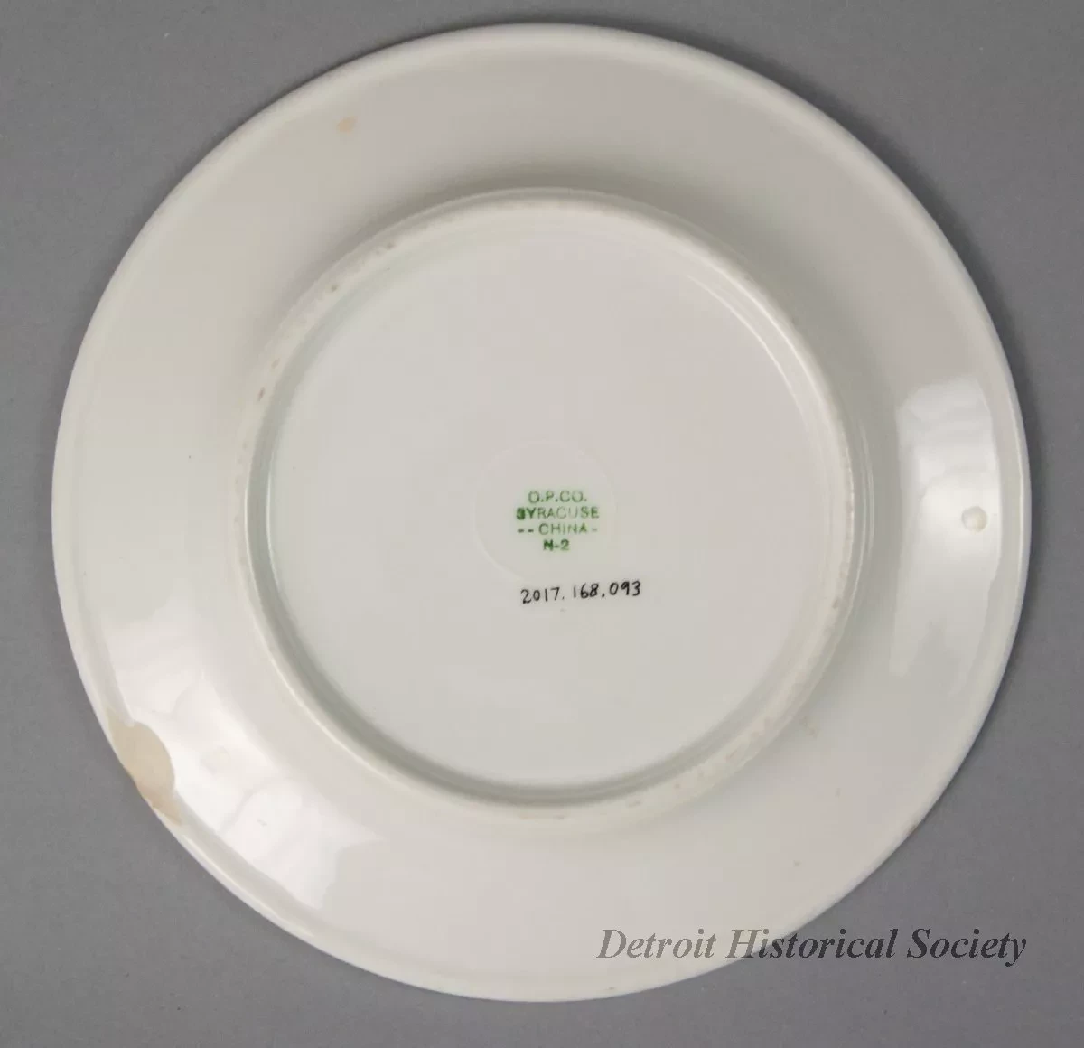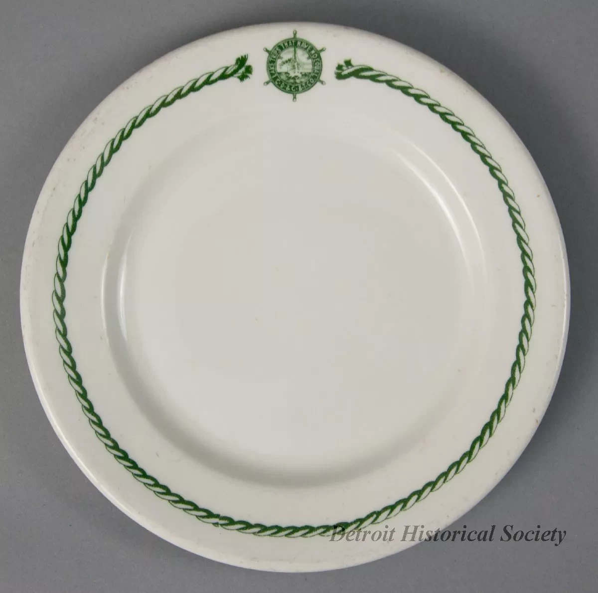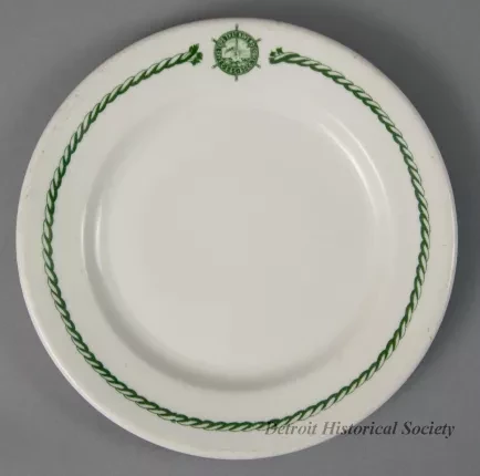 One dessert plate from the dining room of the passenger steamship, SS North American, of the Chicago, Duluth & Georgian Bay Transit Company. The round plate is made of heavyweight, white glazed china. It has a flat, upturned rim with a thickened outer edge. A green rope design is stamped on the top surface of the plate along the midpoint of the rim. At a break in the rope, a small green drawing that depicts a ship's wheel and ship is stamped on the rim along with text that reads "Lake Trips That Have No Equal, C. D. & G. B. T. Co. [Chicago, Duluth & Georgian Bay Transit Company]." The underside is stamped with green text that reads "O.P. Co., Syracuse China," and "N-2."