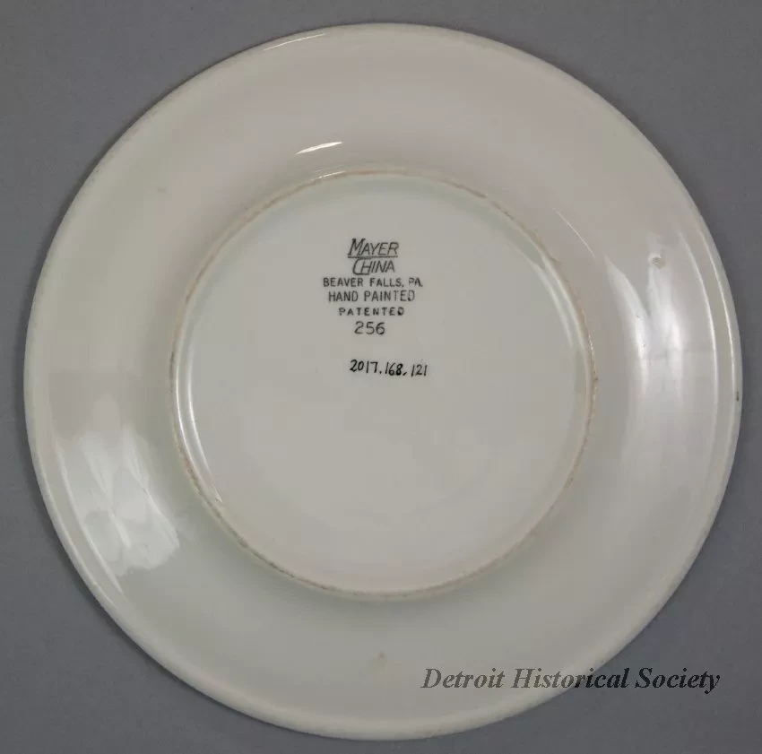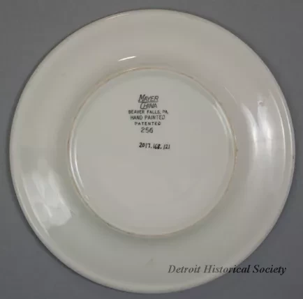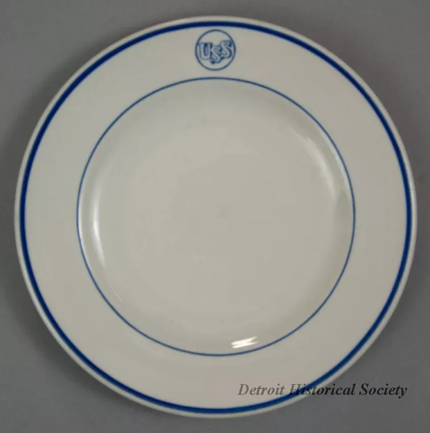 One dessert plate from a dining room of one of the steamships of the United States Steel Corporation fleet. The round plate is made of heavyweight, white glazed china. It has a flat, slightly upturned rim and a thickened outer edge. Narrow blue stripes encircle the rim along the outer and inner edges. The company logo, consisting of a blue circle with the letters, "USS," at the center, is stamped on one area of the rim between the stripes. The underside is stamped with black text that reads "Mayer China, Beaver Falls, PA," and "Hand Painted, Patented, 256."