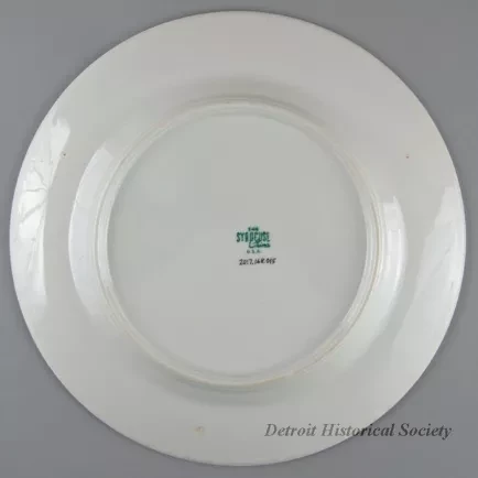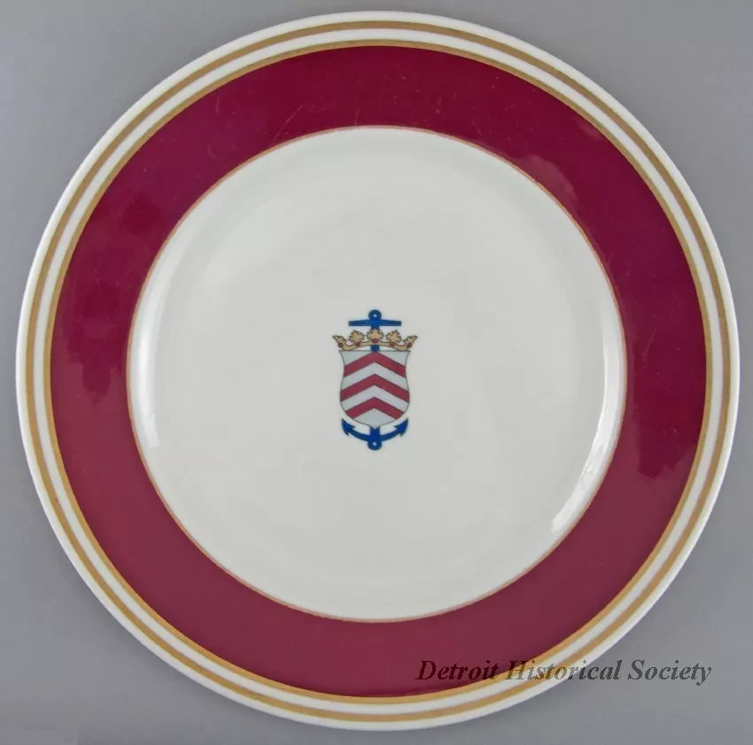 One dinner plate from the dining room of the Manoir Richelieu Hotel owned by Canada Steamship Lines. It is made of heavyweight, white glazed china and has a flat, upturned red rim with a rounded edge. Two narrow gold stripes are located along the outer edge of the rim and a single narrow gold stripe is located at the inner edge. A coat of arms with a shield, crown, and anchor design (Manoir Richelieu Shield pattern) is stamped at the center of the plate. Stamped text on the underside of the plate reads "2-66, Syracuse China, U.S.A."