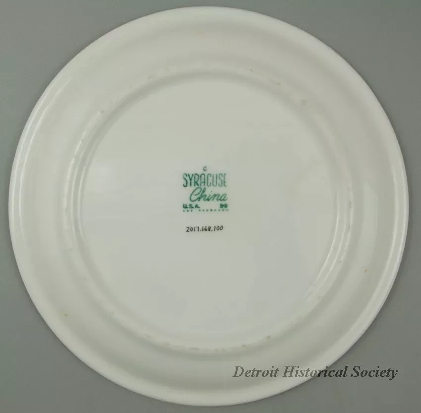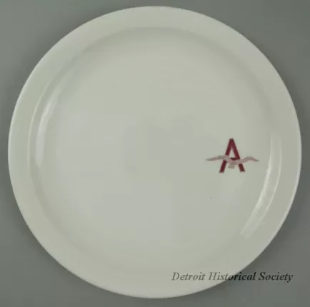 One dinner plate from the dining room of the passenger steamship, SS Aquarama, of the Michigan-Ohio Navigation Company. The round plate is made of heavyweight, white glazed china. It has a narrow, flat, upturned rim with a thickened outer edge. A large red letter, "A," is stamped on one side of the plate near the rim. A gray/white image of a seagull in flight has been superimposed over the letter. The underside is stamped with dark green text that reads "Syracuse China, U.S.A., 89."