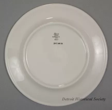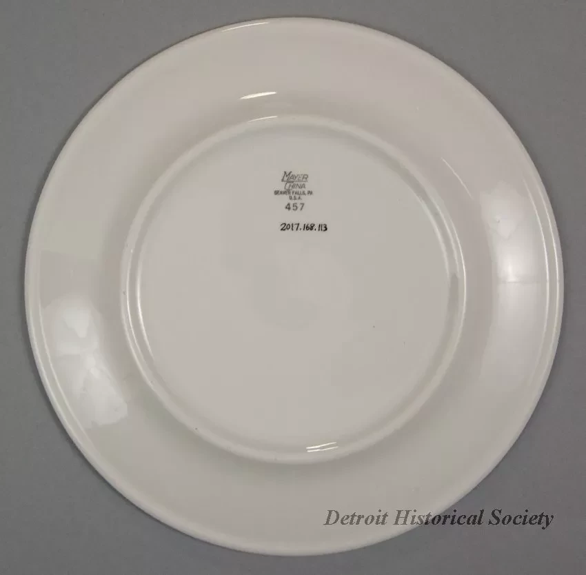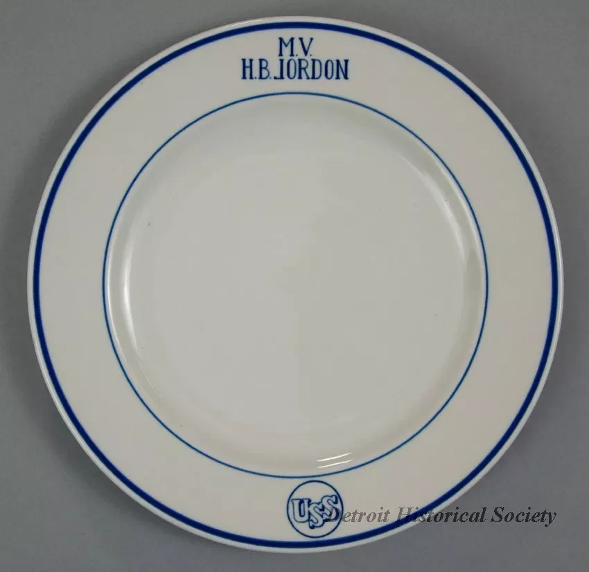One dinner plate from the dining room of the MV Henry B. Jordon of the United States Steel Corporation. The round plate is made of heavyweight, white glazed china. It has a flat, slightly-upturned rim with a thickened outer edge. Narrow blue stripes encircle the rim along the outer and inner edges. Between the stripes, blue text is stamped on the rim that reads "M.V. H.B. Jordon." On the opposite rim, the blue "USS" company logo is stamped. The underside is stamped with black text that reads "Mayer China, Beaver Falls, PA, U.S.A.," and "457."
