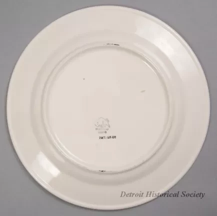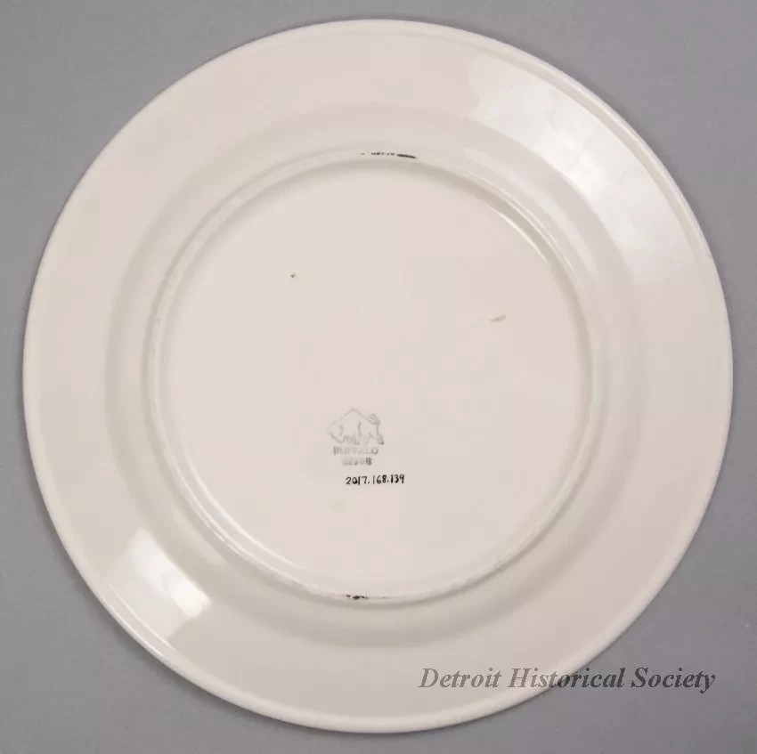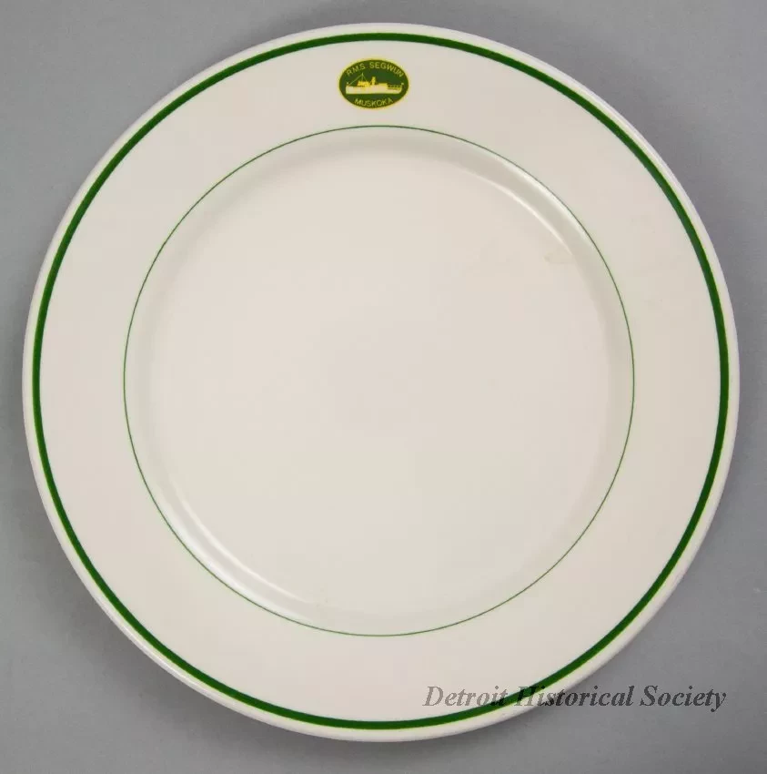 One dinner plate from the dining room of the passenger steamship, R.M.S. [Royal Mail Ship] Segwun, of the Muskoka Lakes Navigation & Hotel Company of Gravenhurst, Ontario. The round plate is made of heavyweight glazed china of a bone/ivory color. It has a flat, upturned rim with a thickened outer edge. Narrow dark green stripes encircle the rim along the outer and inner edges. A green and yellow, oval-shaped logo is stamped on one area of the rim between the stripes. Small yellow text on the logo reads "R.M.S. Segwun, Muskoka." The underside is stamped with a buffalo logo and black text that reads "Buffalo, 0290B."