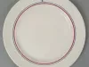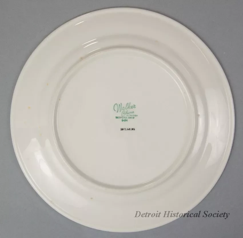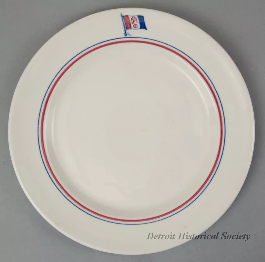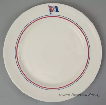 One dinner plate from a dining room of the Pickands Mather & Company steamship fleet. The round plate is made of heavyweight white glazed china. It has a slightly-curved, upturned rim and a thickened outer edge. Narrow blue and red stripes encircle the plate along the inner edge of the rim. A red/white/blue image of the "PM Co." company flag is stamped on one area of the rim above the stripes. The underside is stamped with black text that reads "Walker China, Vitrified," and "Bedford, Ohio, 6-34."