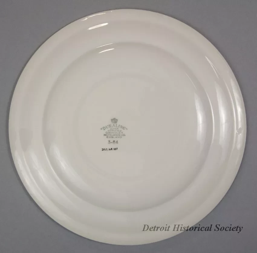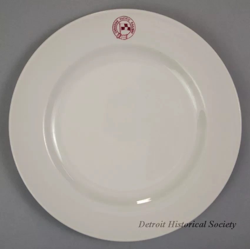 One dinner plate from a passenger steamship dining room of the Canadian Pacific Railroad Great Lakes fleet. The round plate is made of heavyweight white glazed china. It has a flat, slightly-upturned rim and a thickened outer edge. A circular red "Canadian Pacific Railway" logo is stamped on one area of the rim. Stamped black text on the underside of the plate reads "Duraline, Super Vitrified, Grindley Hotelware Co., England," and "3-64."