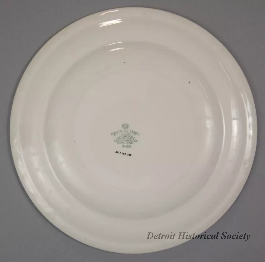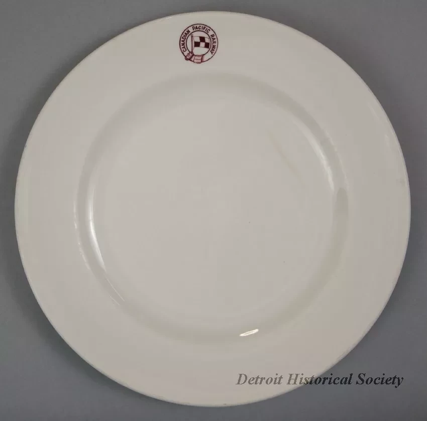 One dinner plate from a passenger steamship dining room of the Canadian Pacific Railroad Great Lakes fleet. The round plate is made of heavyweight white glazed china. It has a flat, slightly-upturned rim and a thickened outer edge. A circular red "Canadian Pacific Railway" logo is stamped on one area of the rim. Stamped black text on the underside of the plate reads "Duraline, Super Vitrified, Grindley Hotelware Co., England," and "3-60."