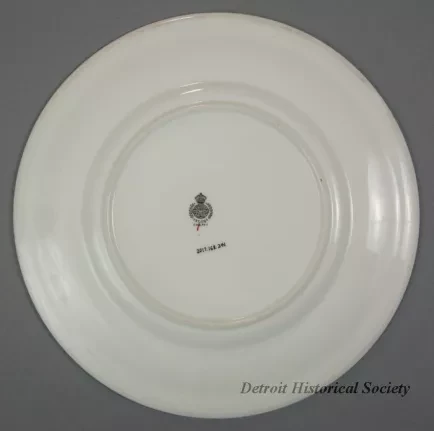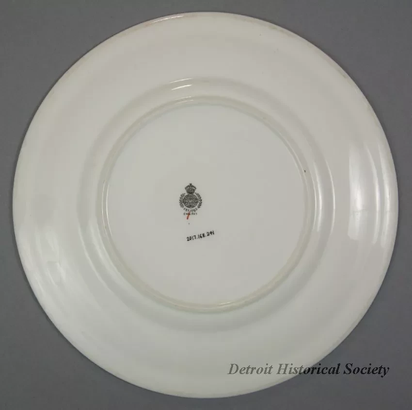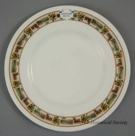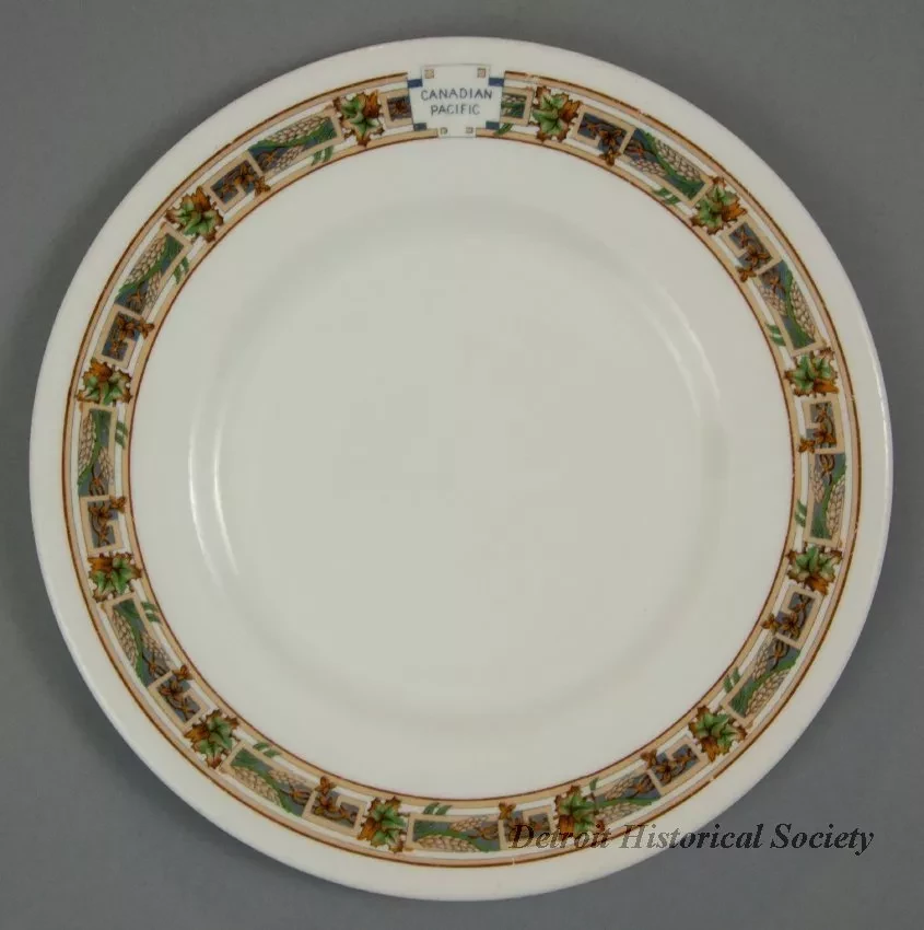 One dinner plate from a railroad dining car of the Canadian Pacific Railroad Great Lakes Service. The round plate is made of heavyweight white glazed china. It has a flat, slightly-upturned rim and a thickened outer edge. A decorative multicolor band, consisting of a floral, wheat stalk, and maple leaf pattern, is printed along the middle of the rim. At a break in the band, blue text reads "Canadian Pacific." The underside of the plate has a black crown/globe logo with black text that reads "Mintons, Est. 1793," and "England." Additional text is stamped in the china that reads "Minton China, 4-43."