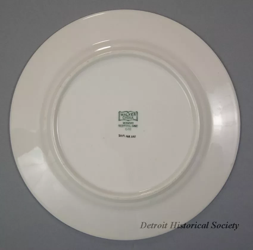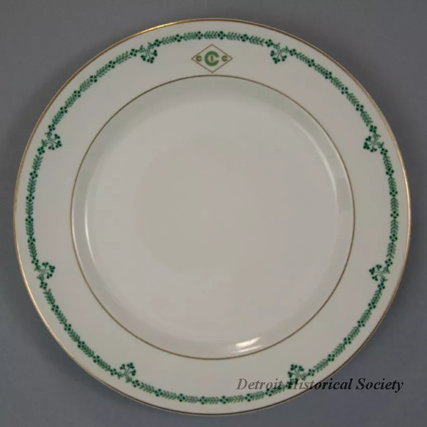 One dinner plate from the dining room of the bulk carrier, SS WALTER A. STERLING, of the Cleveland Cliffs Iron Company. The round plate is made of heavyweight glazed china in a bone/ivory color. It has a flat, upturned rim and a rounded outer edge. Narrow gold-colored stripes encircle the outer and inner edges of the rim. Also, a band of small green leaves encircles the rim just above the midpoint. A green and gold-colored, diamond-shaped "CCIC [Cleveland Cliffs Iron Company]" logo is stamped on one area of the rim just above the inner stripe. Stamped black text on the underside of the plate reads "Walker China, Vitrified" and "Bedford, Ohio, C-52."
