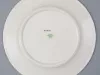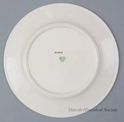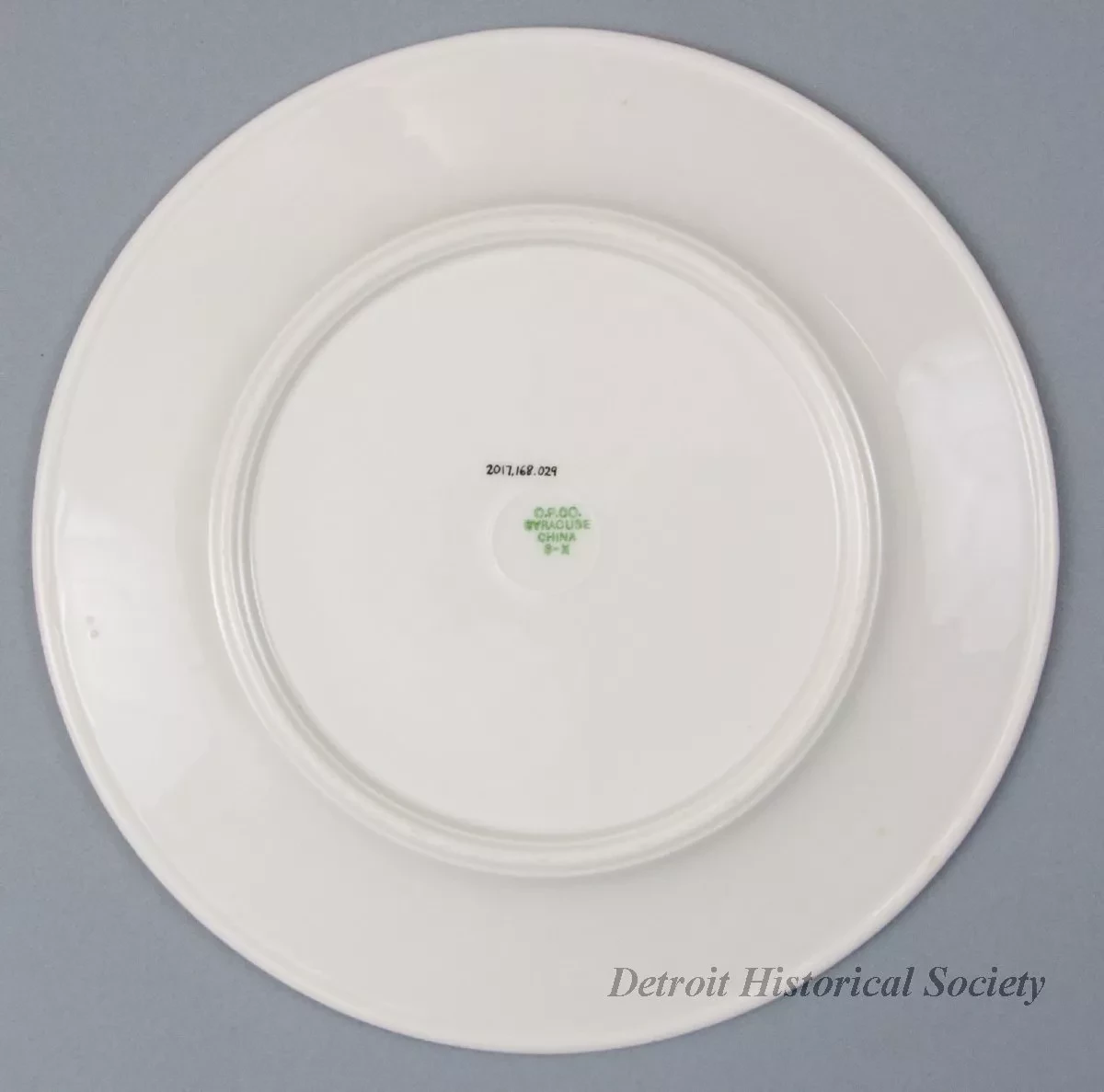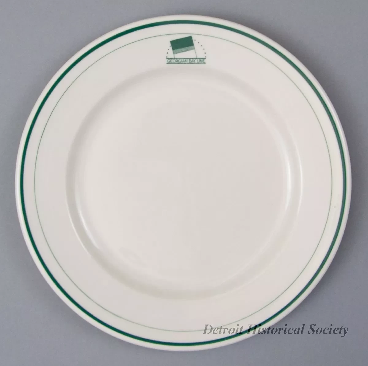 One dinner plate from a passenger steamship dining room of the Georgian Bay Line. The plate is made of heavyweight, white glazed china and has a flat, upturned rim with a thickened outer edge. Narrow dark green stripes are located along the outer edge of the rim and just above the midpoint. A small dark green logo is stamped on the rim that shows the top of a smokestack along with dark green text that reads "Georgian Bay Line." Stamped text on the underside of the plate reads "O.P. Co., Syracuse China" and "9-X."