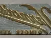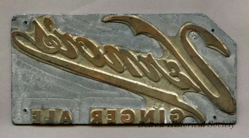 One engraving plate used for printing Vernor's advertisements, brochures, and/or product packaging. The rectangular plate is made from thin sheets of copper and zinc that have been bonded together. The copper side has a flat relief engraving that shows "Vernor's" in script text along with "Ginger Ale" in smaller block text. Some of the zinc has been exposed in deep-cut areas where all of the copper has been cut away. In one of the deep-cut areas, a small eagle emblem is stamped along with the letters "I.S.& E.U. [International Stereotypers and Electrotypers Union]," and small numbers that read "54 4."