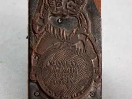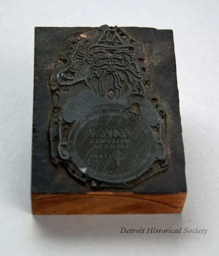 One engraving plate used for printing Vernor's advertisements, brochures, and/or product packaging. The rectangular plate is made from a thin sheet of zinc that has been mounted on a thin sheet of cardboard and then attached to a wood block with seven small nails. The plate has a flat relief engraving that depicts an image of the Vernor's gnome who is straddling a large wooden barrel of ginger ale syrup. Text on the end of the barrel reads "Flavor Mellowed in Wood 4 Years."