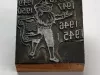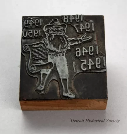 One engraving plate used for printing Vernor's advertisements, brochures, and/or product packaging. The rectangular plate is made from a thin sheet of zinc that has been mounted on a wood block with five small nails. The plate has a flat relief engraving that depicts an image of the Vernor's gnome holding a scroll. Adjacent text shows the years "1945, 1946, 1947, 1949, 1950."