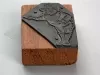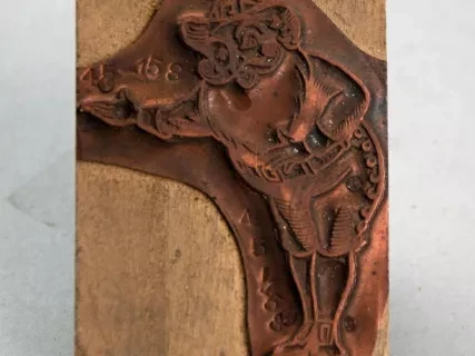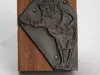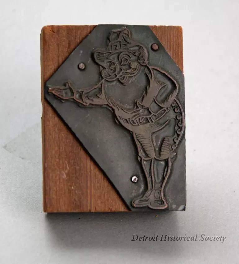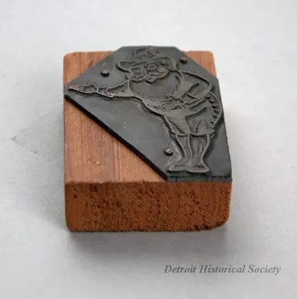 One engraving plate used for printing Vernor's advertisements, brochures, and/or product packaging. The irregularly-cut plate is made from thin sheets of copper and zinc that have been bonded together. Three small nails have been used to attach the plate to a wood block. The copper side has a flat relief engraving that depicts an image of the Vernor's gnome, who is standing while bent slightly at the waist, and is gesturing with his outstretched right arm.