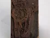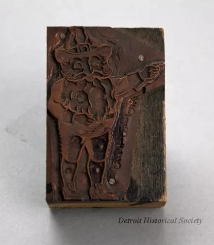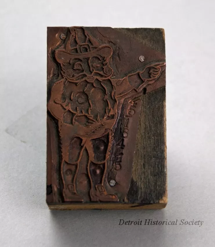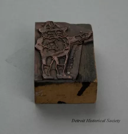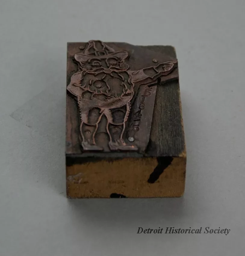 One engraving plate used for printing Vernor's advertisements, brochures, and/or product packaging. The irregularly-cut plate is made from thin sheets of copper and zinc that have been bonded together. Four small nails have been used to attach the plate to a wood block. The copper side has a flat relief engraving that depicts an image of the Vernor's gnome, who is standing and pointing with his outstretched left arm. The numbers, "45/164/5," are stamped near the edge of the image.