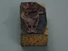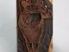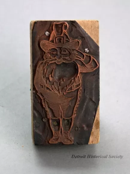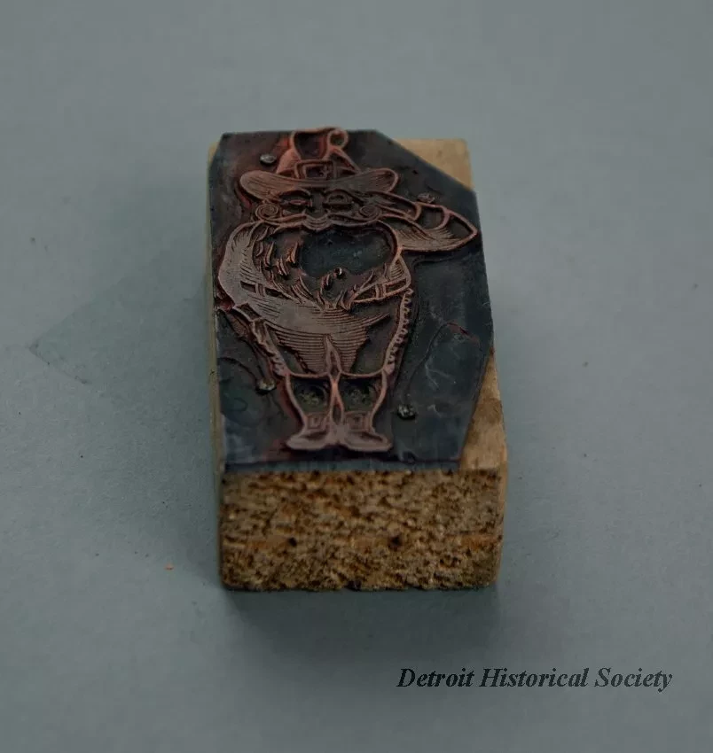 One engraving plate used for printing Vernor's advertisements, brochures, and/or product packaging. The irregularly-cut plate is made from thin sheets of copper and zinc that have been bonded together. Four small nails have been used to attach the plate to a wood block. The copper side has a flat relief engraving that depicts an image of the Vernor's gnome, who is standing and giving a military salute with his left arm.
