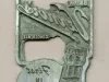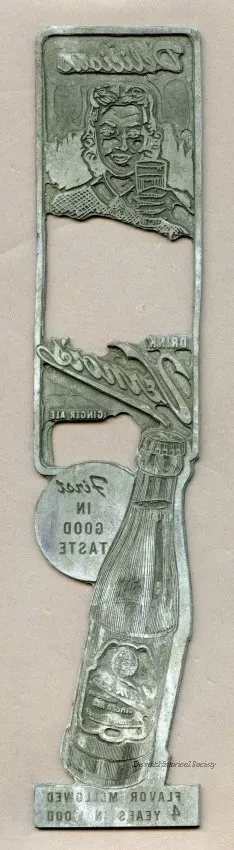 One engraving plate used for printing Vernor's newspaper advertisements. The rectangular plate is made from a thin sheet of magnesium which has several engraved areas that show text and images of a bottle of Vernor's ginger ale as well as the head and shoulders of a young woman who is holding a glass of ginger ale. The text and images are shown in reverse. Some areas of the sheet have been cut out to allow space for other advertisement text that would be added separately.