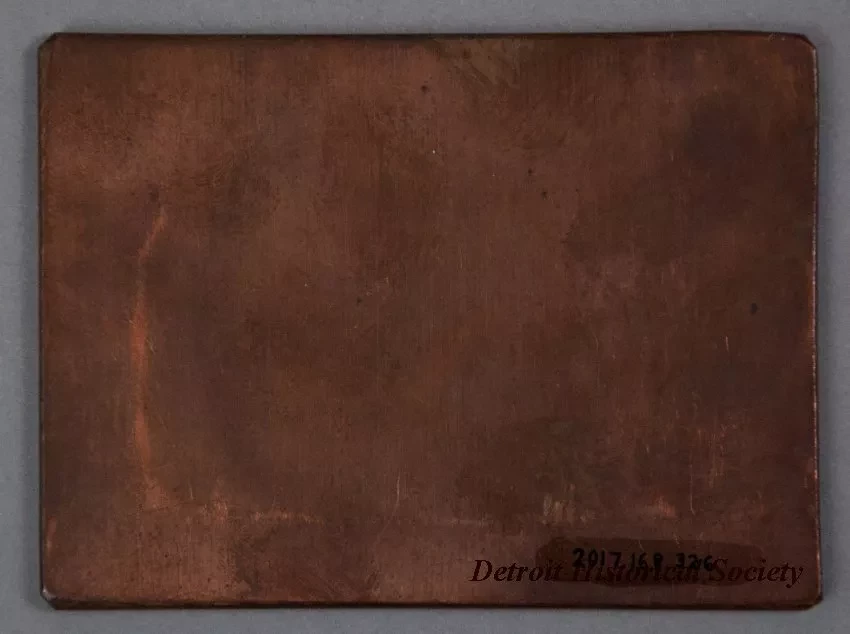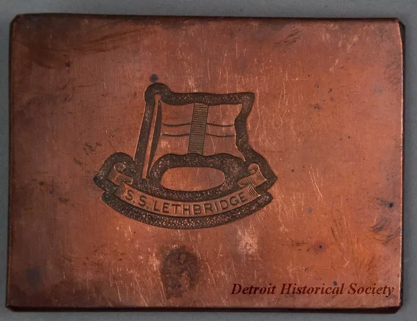 One engraver's plate that features the, SS LETHBRIDGE, a package freight steamship of Canada Steamship Lines. The plate is made from a rectangular piece of 1/8-inch thick copper sheet. It shows an engraved image of the company flag and ship name, "S.S. Lethbridge," at the center of the polished top surface. The edges/corners are slightly rounded and the underside has a brushed finish. No manufacturer's name or marks are shown.
