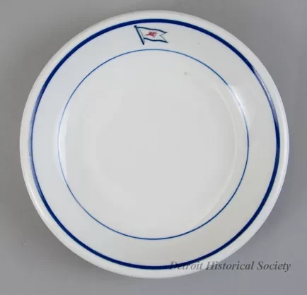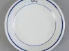 One lunch plate from the tanker, NEW HAVEN SOCONY, of the Socony-Vacuum Oil Company. The plate is made of heavyweight, white glazed china. It has curved sides, a rounded and thickened top rim, and a flat bottom. Narrow blue stripes are located on the top surface of the plate below the rim and at the base of the curved side. On one area of the rim, the company logo is stamped between the stripes. The logo shows a blue and white company burgee with a red Pegasus at the center. The plate underside is stamped with a green logo that shows a seated Indian along with green text that reads "Shenango China, New Castle, PA."