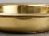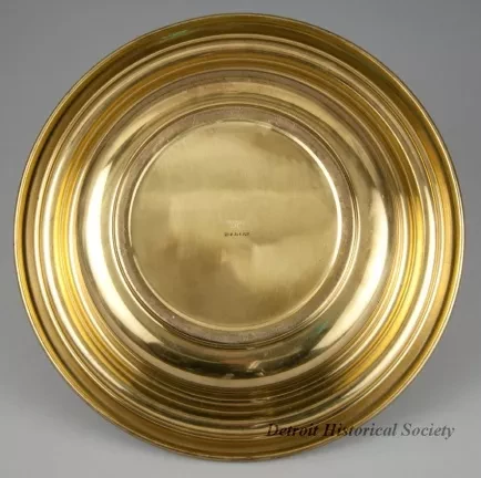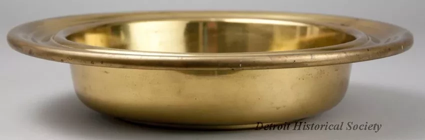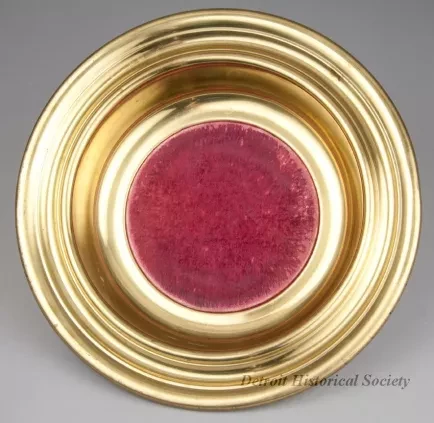 One brass offertory plate from St. James Lutheran Church, Detroit. The round plate has a decorative rim with rounded sides and a flat bottom. The inside bottom has a shallow inset which holds a circular piece of cardboard that is covered with red velvet. The underside of the plate is stamped with small text that reads "Sudbury, SB116."