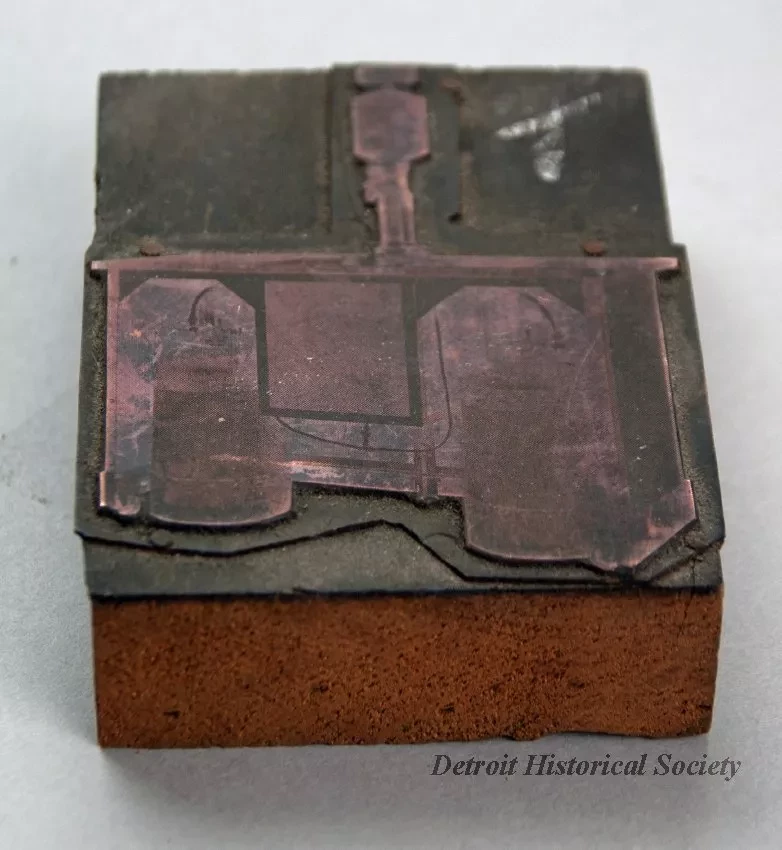 One halftone copper printing plate used for printing Vernor's advertisements, brochures, and/or product packaging. The rectangular plate is made from a thin sheet of copper that has been cut and etched with a halftone image of a "Vernor's Ginger Ale" soda fountain dispenser. Small nails have been used to attach the copper sheet to a wood block.