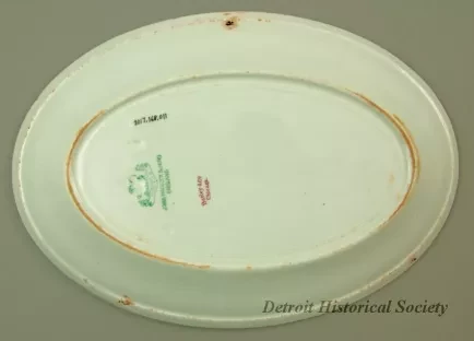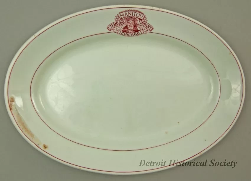 One platter from the dining room of the passenger steamship, SS Manitou, of the Manitou Steamship Company. The oval-shaped platter is made of heavyweight, white glazed china. It has a flat upturned rim with a thickened outer edge. Narrow red stripes encircle the platter along the inner and outer edges of the rim. The decorative red logo of the "Manitou Steamship Company, Chicago," is stamped on the rim at the center of one of the long sides of the platter. The underside is stamped with a green logo and text that reads "Vitrified" and "John Maddock & Sons, England." Additional red text reads "Burley & Co., Chicago."