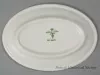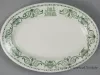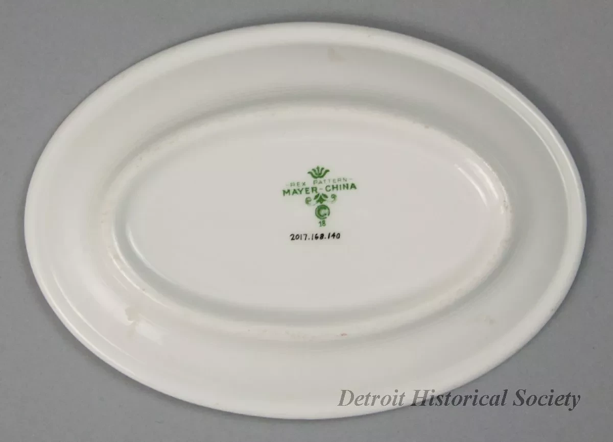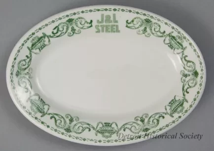 One small platter from a river towboat or shoreside facility of the Jones & Laughlin Steel Company of Pittsburgh. The oval-shaped platter is made of heavyweight, white glazed china. It has a flat, upturned rim with a thickened outer edge. A narrow green diamond/dot and double dash pattern is stamped along the outside edge. A decorative pattern of green urns and floral swags is stamped across the remaining width of the rim. At a break in the decorative pattern at the center of one of the long sides, green text reads "J&L Steel." The underside is stamped with a small green floral logo and text that reads "Rex Pattern, Mayer China."