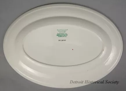 One large serving platter from a dining room of one of the passenger steamships of the Temiskaming Navigation Company, Ltd., of Ontario. The oval-shaped platter is made of heavyweight, white glazed china. It has a slightly-curved, upturned rim with a thickened outer edge. One narrow red stripe encircles the rim along the midpoint. At a break in the stripe at the center of one of the long sides, a red/black/white image of the company flag is stamped along with black text that reads "The Temiskaming Nav. Co., Ltd." The underside is stamped with black text that reads, "W. H. Grindley & Co., Vitrified, England," and "Furnished by Nerlich & Co., Toronto."