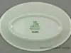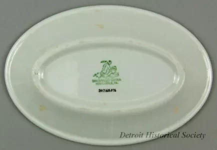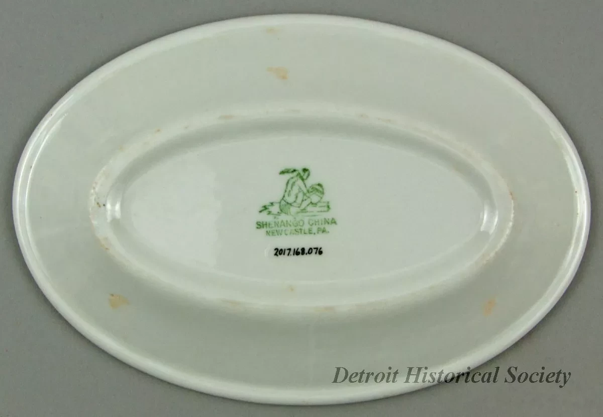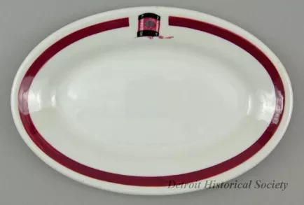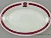 One small platter from the bulk carrier, SS E. J. Block, of the Inland Steel Company. The oval-shaped platter is made of heavyweight, white glazed china. It has a flat, upturned rim with a thickened outer edge. A wide red stripe encircles the rim at the midpoint. At a break in the stripe at the center of one of the long sides, the company logo is shown on a smokestack. The underside is stamped with a green logo that depicts a seated Indian and green text that reads "Shenango China, New Castle, PA."