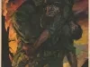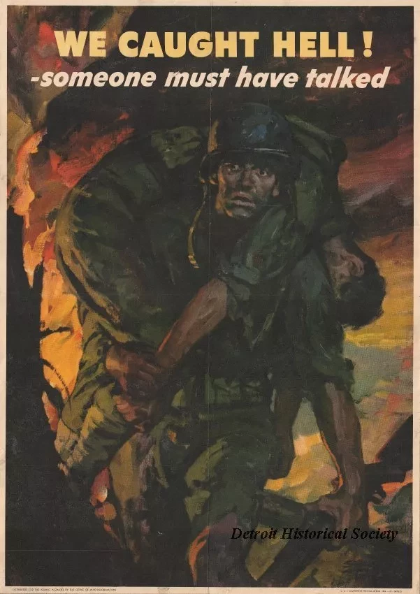 World War II poster with the message, "We Caught Hell! - Someone must have talked." The poster shows a color drawing of one soldier who is carrying an injured soldier on his back. A battlefield scene with flames can be seen in the background. The artist's name, Saul Tepper, is shown in the lower right corner. Small printed text along the bottom edge of the poster shows "Distributed For the Issuing Agencies by the Office of War Information" and "U.S. Government Printing Office: 1944 - O - 567525." The poster is mounted in a black wood frame with a white matte and glass.