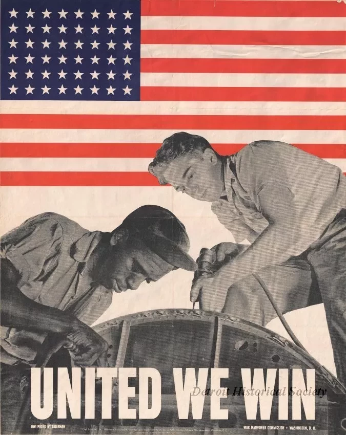 World War II poster with the message, "United We Win." The poster has a color drawing of an American flag at the top and a black and white photographic image at the bottom that shows two factory workers who are assembling an airplane fuselage. Small printed text along the bottom of the poster shows "OWI Photo by [Alexander] Liberman, War Manpower Commission, Washington, D.C" Additional small printed text shows "OWI Poster No. 38. Additional copies may be obtained upon request from the Division of Public Inquiries, Office of War Information, Washington, D.C., U.S. Government Printing Office: 1943-O-506015." The poster is mounted in a black wood frame with a white matte and glass.
