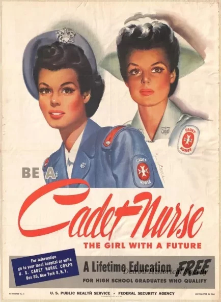 World War II poster with the messages, "Be A Cadet Nurse - The Girl With A Future" and "A Lifetime Education Free for High School Graduates Who Qualify." The poster shows head and shoulders drawings of two cadet nurses in uniform. The artist's name, Jon Whitcomb, is shown near the lower right corner of the drawing. Small printed text along the bottom edge of the poster shows "NE Poster No.3, U.S. Public Health Service, Federal Security Agency, Distributed by OWI" and "U.S. Government Printing Office: 1944-O-599074." The poster is mounted in a black wood frame with a white matte and glass.