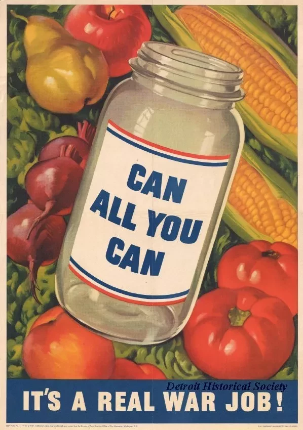 World War II poster with the message, "Can All You Can. It's a Real War Job." The poster shows a color drawing of an empty glass canning jar that is surrounded by fruits and vegetables. Small printed text along the bottom edge of the poster shows OWI Poster No. 77 - 16" x 22 1/2". Additional copies may be obtained upon request from the Division of Public Inquiries, Office of War Information, Washington, D.C." and "U.S. Government Printing Office: 1943-O-533993." The poster is mounted in a black wood frame with a white matte and glass.