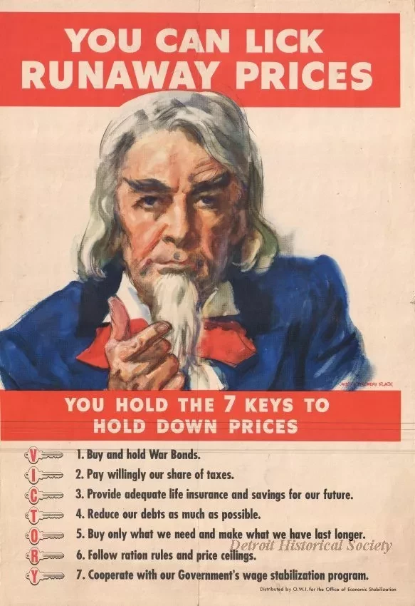 World War II poster with the message, "You Can Lick Runaway Prices. You Hold the 7 Keys To Hold Down Prices." The poster shows a color drawing of Uncle Sam along with a list of seven actions that citizens can take in order to help the war effort. Seven keys are shown near the lower left edge with red letters that spell "VICTORY." The artist's name, James Montgomery Flagg, is shown near the lower right corner of the drawing. Small printed text near the lower right corner of the poster shows "Distributed by O.W.I. for the Office of Economic Stabilization." The poster is mounted in a black wood frame with a white matte and glass.