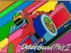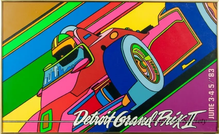 Framed 1983 Detroit Grand Prix poster. The poster features a vibrantly colored angled illustration of a formula car with its driver inside, and the city's skyline reflected in its windshield. "Detroit Grand Prix II," is printed along the bottom of the composition, and "June 3-4-5/'83" is printed vertically along the lower right edge. The signature of the artist, Joseph E. Grey II, is near the upper right corner of the composition. The poster is housed within a gold metal frame.