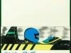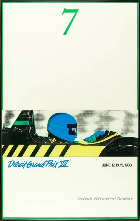 Framed 1988 Detroit Grand Prix poster. The poster features a stylistically colorized half-toned photographic image of a driver in a formula car's cockpit in profile, against a white background. The number "7," is printed at the top of the composition, and "Detroit Grand Prix VII, June 17, 18, 19, 1988," is printed below the image of the driver. The poster is housed within a gold metal frame.