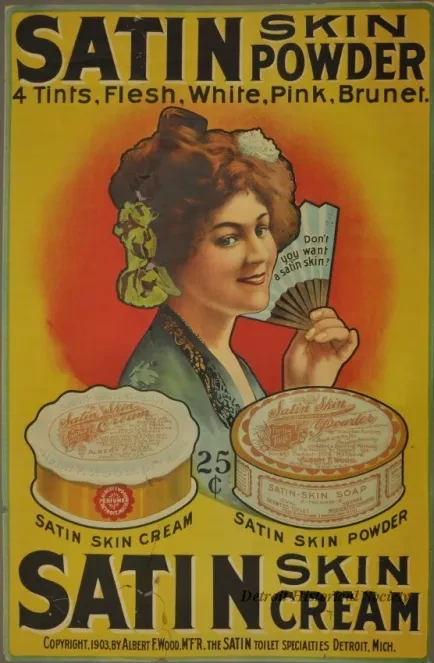1 - Advertising poster; Yellow poster with black text at top of poster: "SATIN Skin Powder 4 Tints, Flesh, White, Pink, Brunet" manufactured by Satin Toilet Specialties. The advertisement features a color image of a woman with a paper fan containing the text in black lettering: "Don't you want a satin skin?", tins of both products are depicted beneath her, with their price--25¢, and printed at bottom: "Copyright, 1903, By Albert F. Wood, M'F'R. The Satin Toilet Specialties Detroit, Mich."