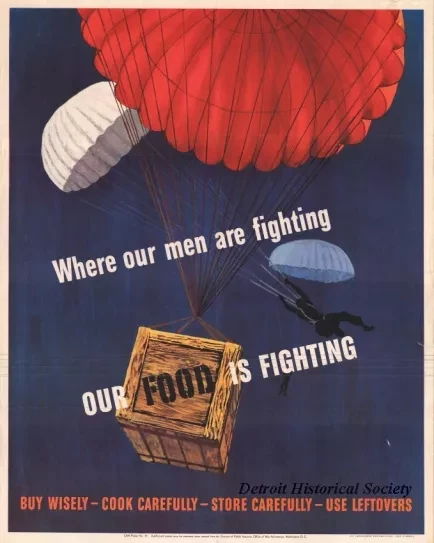 World War II poster with the message, "Where our men are fighting, Our food is fighting. Buy wisely - cook carefully - store carefully - Use Leftovers." The poster shows a color drawing of two paratroopers and a crate of food supplies that are descending on parachutes. Small printed text along the lower edge of the poster shows "OWI Poster No. 35. Additional copies may be obtained upon request from the Division of Public Inquiries, Office of War Information, Washington, D.C." and "U.S. Government Printing Office: 1943 - O - 506016." The poster is mounted in a black wood frame with a white matte and glass.