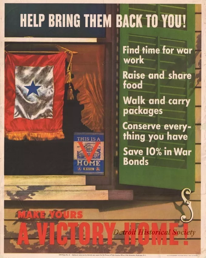 World War II poster with the messages, "Help Bring Them Back To You!" and "Make Yours a Victory Home!" The poster shows a color drawing of a residential home window which has a "Victory Home" sign and flag on display. The artist's name, [Francis] Criss, is shown on the bottom of the window sign. Printed text along the right side of the poster lists five ways that citizens can help the war effort at home. The poster is mounted in a black wood frame with a white matte and glass.