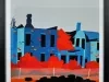 One limited edition (1/40) framed art print entitled "City Scape 01" by Jesse Kassel. The color print depicts a stylized view of a row of 2-story buildings that are burning. A fence and pile of used tires are visible in the foreground. The artist has signed his name, "Jesse Kassel," in pencil at the lower right corner. The print is mounted in a plain black wood frame with clear protective glass.