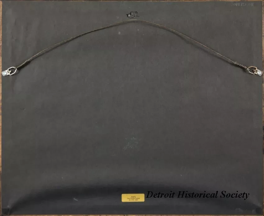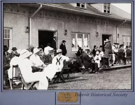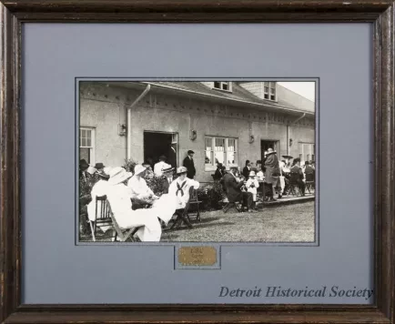 One framed photograph of a summertime event at the Edison Boat Club in Detroit. The sepia-toned photo looks along the front of the clubhouse building and shows several groups of people (men, women, and children) who are seated on lawn chairs. All are well-dressed. Members of a small brass band are seated on an adjacent patio. The photo is held in an oak wood frame with blue/gray matte borders and protective glass. An engraved brass nameplate beneath the photo reads "E. B. C. Regatta, 1921." The oak wood frame has been finished with a dark brown stain. A gold-colored adhesive label on the back has black text that reads "Grant's Fine Picture Frames, 810-791-4982."