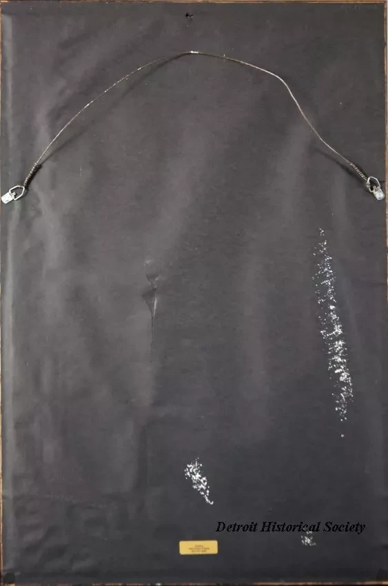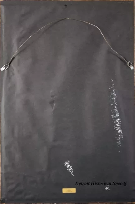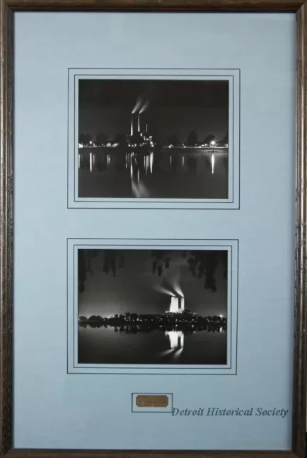 Two photographs in a frame that show nighttime views of the Detroit Edison Conner Creek Power Plant in Detroit. The upper photo shows an early view of the plant in the 1920's. The lower view shows the plant in the 1960's with its tall, distinctive smokestacks that were locally known as the "seven sisters" and "two brothers." Lights along the shoreline are reflected on the calm waters of the Detroit River in both photos. The photo is held in an oak wood frame with blue/gray matte borders and protective glass. An engraved brass nameplate beneath the lower photo reads "Conners Creek." The oak wood frame has been finished with a dark brown stain. A gold-colored adhesive label on the back has black text that reads "Grant's Fine Picture Frames, 810-791-4982."