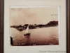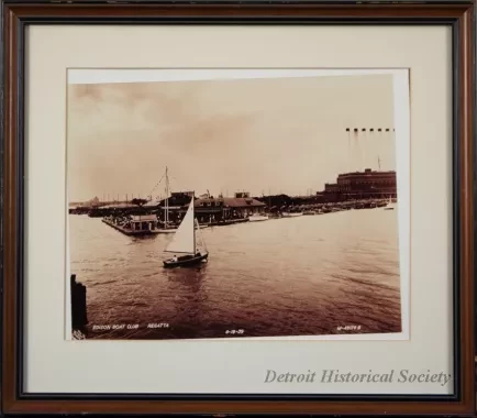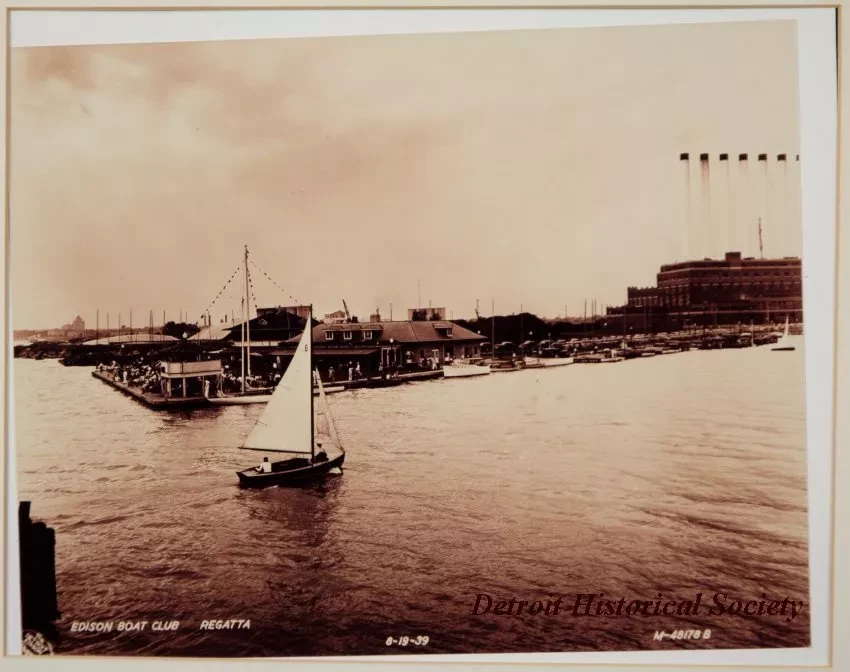 One framed photograph of the Edison Boat Club in Detroit. The sepia-toned photo shows an elevated view of the harbor entrance and clubhouse building. A small sailboat is sailing from the Detroit River into the harbor in the lower left foreground. The Detroit Edison Company Conner Creek Power Plant can be seen in the right background. The photo is held in a wood frame with an off-white matte border, and protective glass. White text along the lower edge of the photo reads "Edison Boat Club Regatta, 8-19-39," and "M-48178 B." The wood frame has been finished with brown stain and black paint.