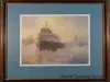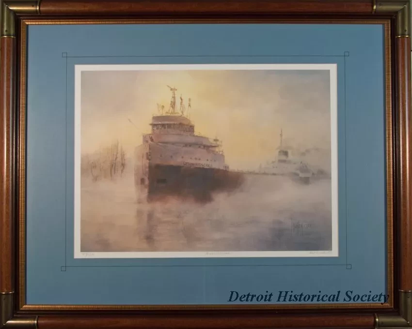 One framed, limited edition (169/250) color reproduction print of a painting of the bulk carrier, SS EDMUND FITZGERALD, of the Columbia Transportation Company. The print shows a port side bow view of the ship which is underway slowly in a calm, misty river in the early morning and gives the appearance of a ghost ship. Handwritten pencil text near the lower center edge shows the title, "River Smoke." The artist has signed his name, "Pat Norton," at the lower right corner. The print is held in a decorative wood frame with a blue matte and protective glass.