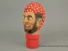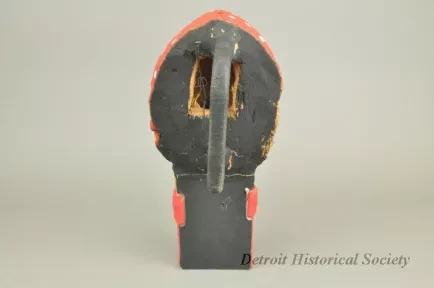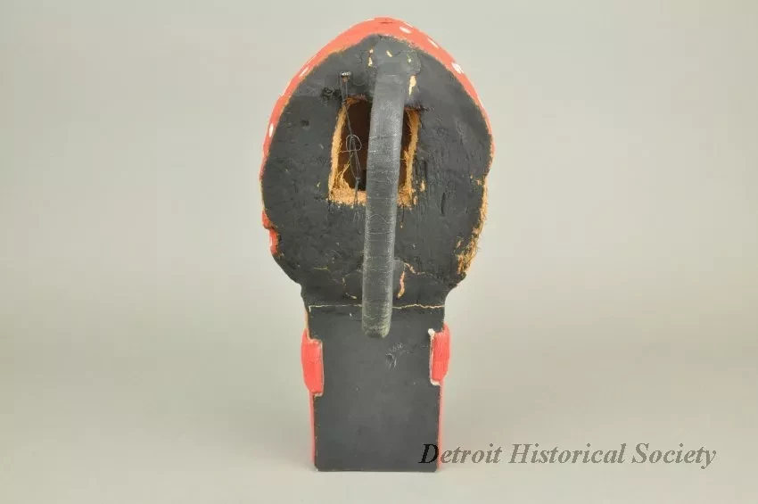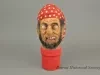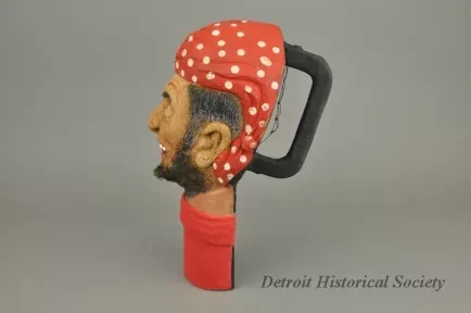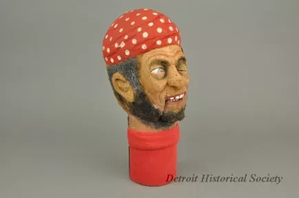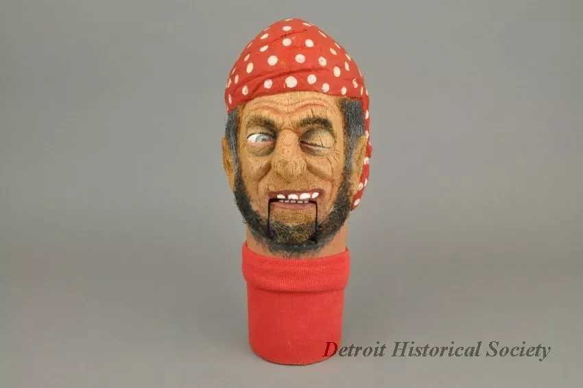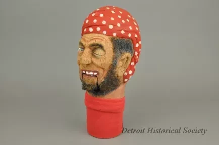 Puppet, hand-held with handle-bar in back. Pirate with red headscarf with white dots, red turtle neck. Head / neck puppet. Carved coconut shell w/ possible papier-mâché sculpted neck. Jaw once moved . Painted beard/face. very good condition, cracking to handle, missing tool for mouth movement. Likely used by Captain Jolly (Toby David) on the Popeye and Pals television show on CKLW.