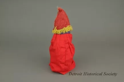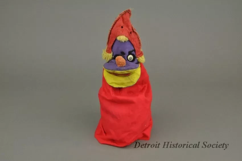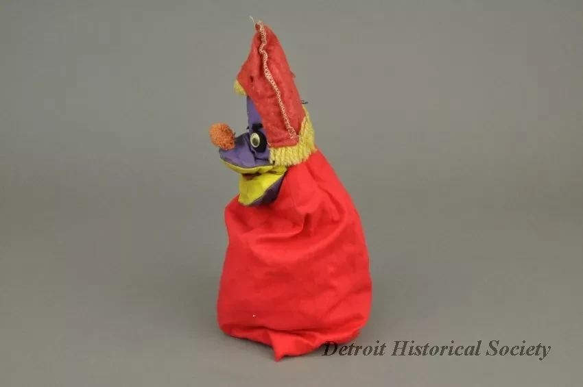 Clown puppet with sock inside. Felt hat, yarn hair, purple cotton face, red hat and body, no tag. "Stanley", voiced by Captain Jolly (Toby David) on the Popeye and Pals television show on CKLW.