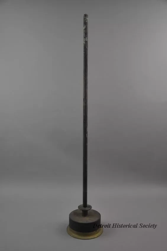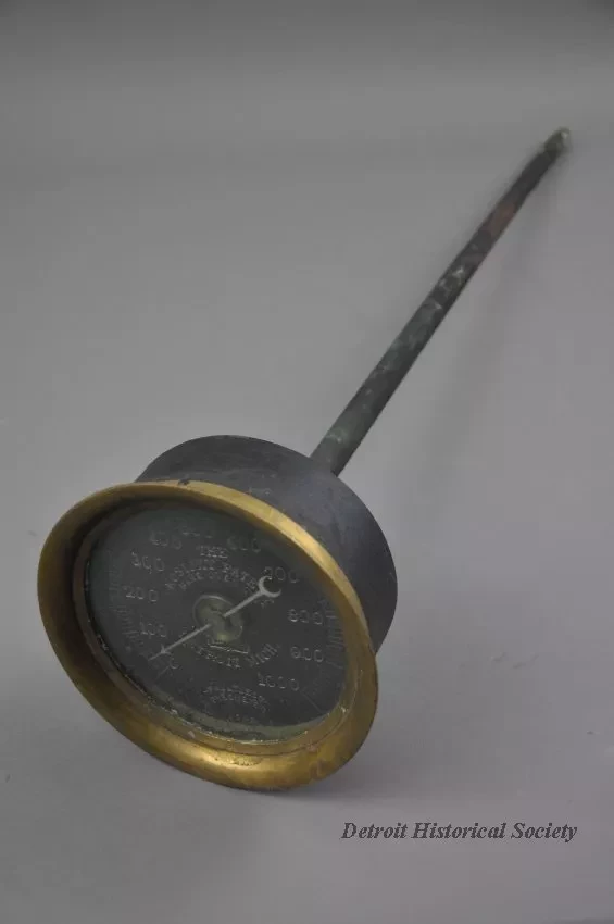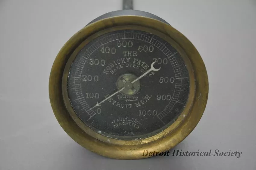 One pyrometer from a commercial bake oven. The pyrometer has a 35.5-inch long, 0.75-inch diameter copper or brass sensor rod which transmits heat to a gauge that is mounted at one end of the rod. The 7-inch diameter gauge has a cast iron case and a protective glass cover with a rounded brass bezel. The gauge face (beneath the glass) is painted black and has a single arrow at the center. Engraved graduation marks and numbers along the perimeter of the face show temperatures from 0 to 1000 degrees Fahrenheit. Engraved text on the gauge face shows "The Kosicky Patent Bake Oven Co., Detroit, Mich." and "Faultless Pyrometer."