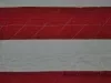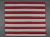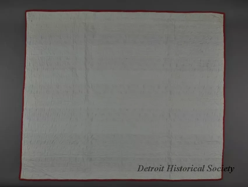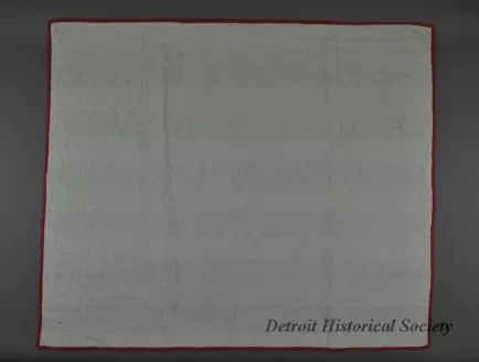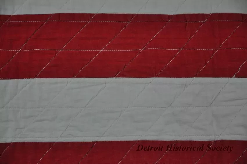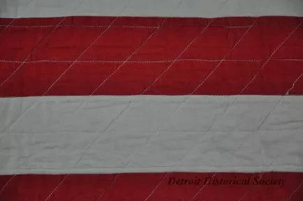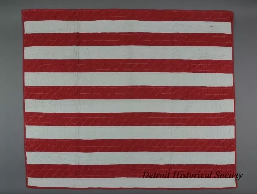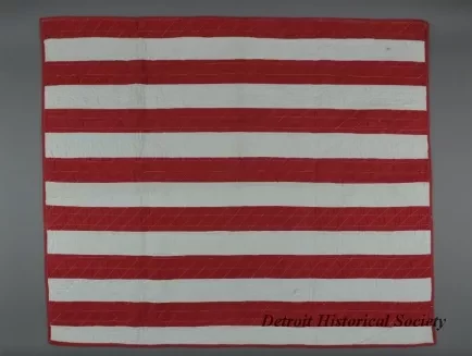 1-Quilt. A child's quilt, made of cotton fabric and machine stitched. Fourteen bands of alternating red and white stripes oriented along the length of the quilt. Each band is 2.5" in thickness. The stripes are stitched together lengthwise and diagonally. The quilt is edged in red fabric and backed with white fabric.