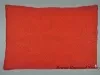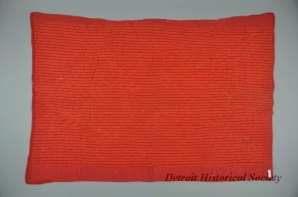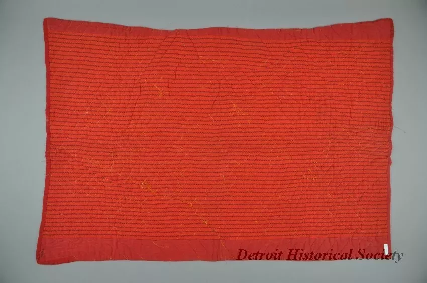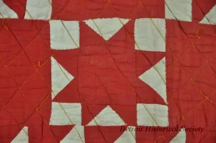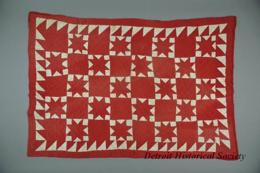 1-Quilt. Doll sized. Quilted red and white cotton in checked pattern. Solid red squares alternate with white squares that feature a red, eight-pointed star. White inner border with red saw-tooth pattern and red outer border. Solid, red cotton on the back. The pattern appears to be stitched together by hand, while the entire piece is quilted by yellow, machine stitched thread in an irregular, wavy design. The reverse has unfinished, loose threads.